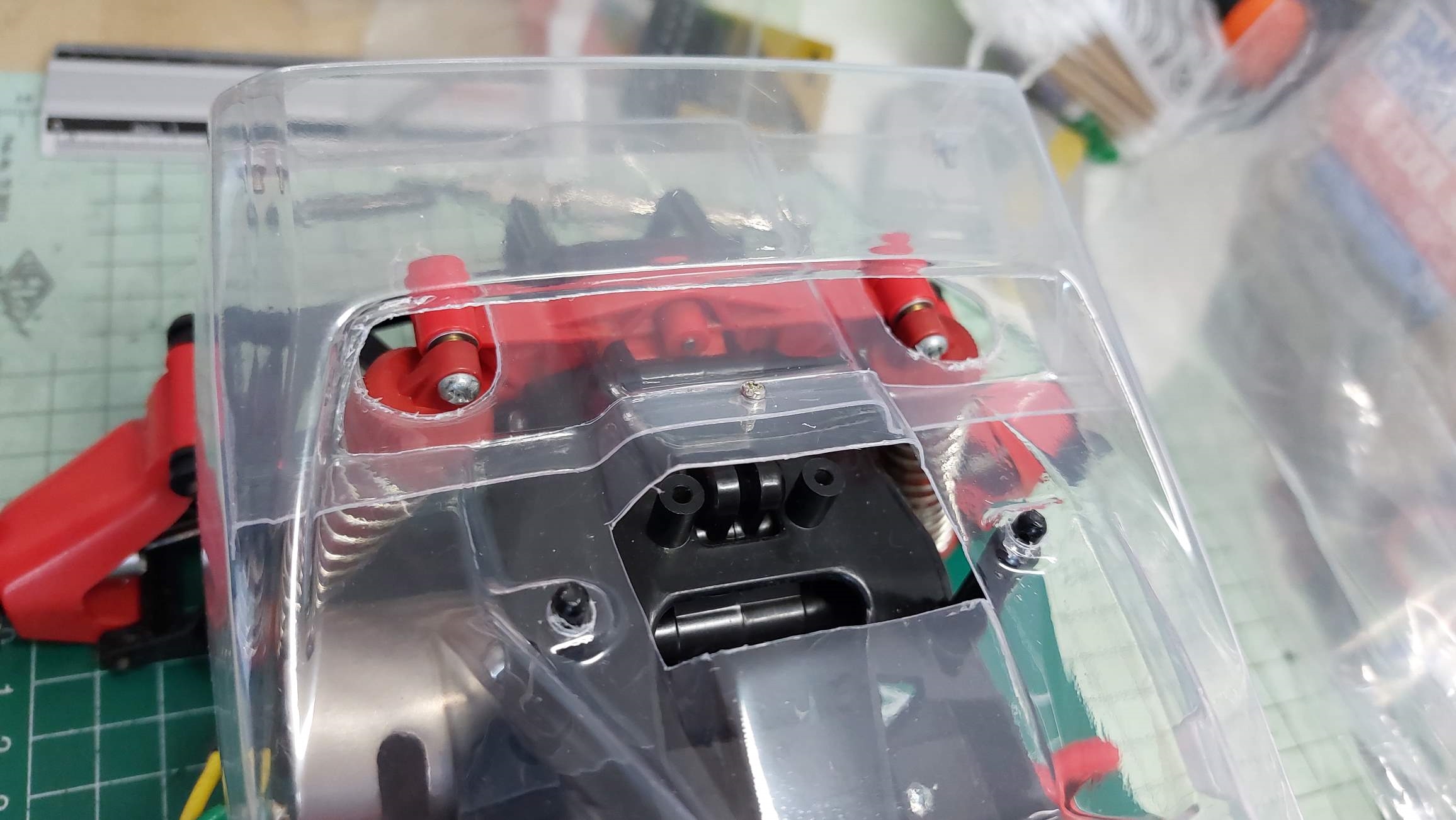 Les grandes découpes. 2 dans le mini aileron du dessous pour laisser la place aux amortisseurs et 2 dans la carrosserie, 1 pour laisser passer l'air sur le mini aileron et 1 pour la résistance du variateur mécanique. J'ai longtemps hésité pour ce dernier trou, mais pour le fun et le look vintage, peut-être que j'installerai un vario mécanique.